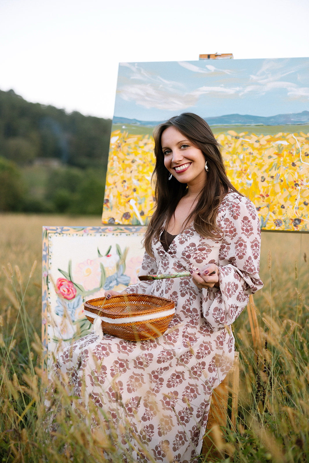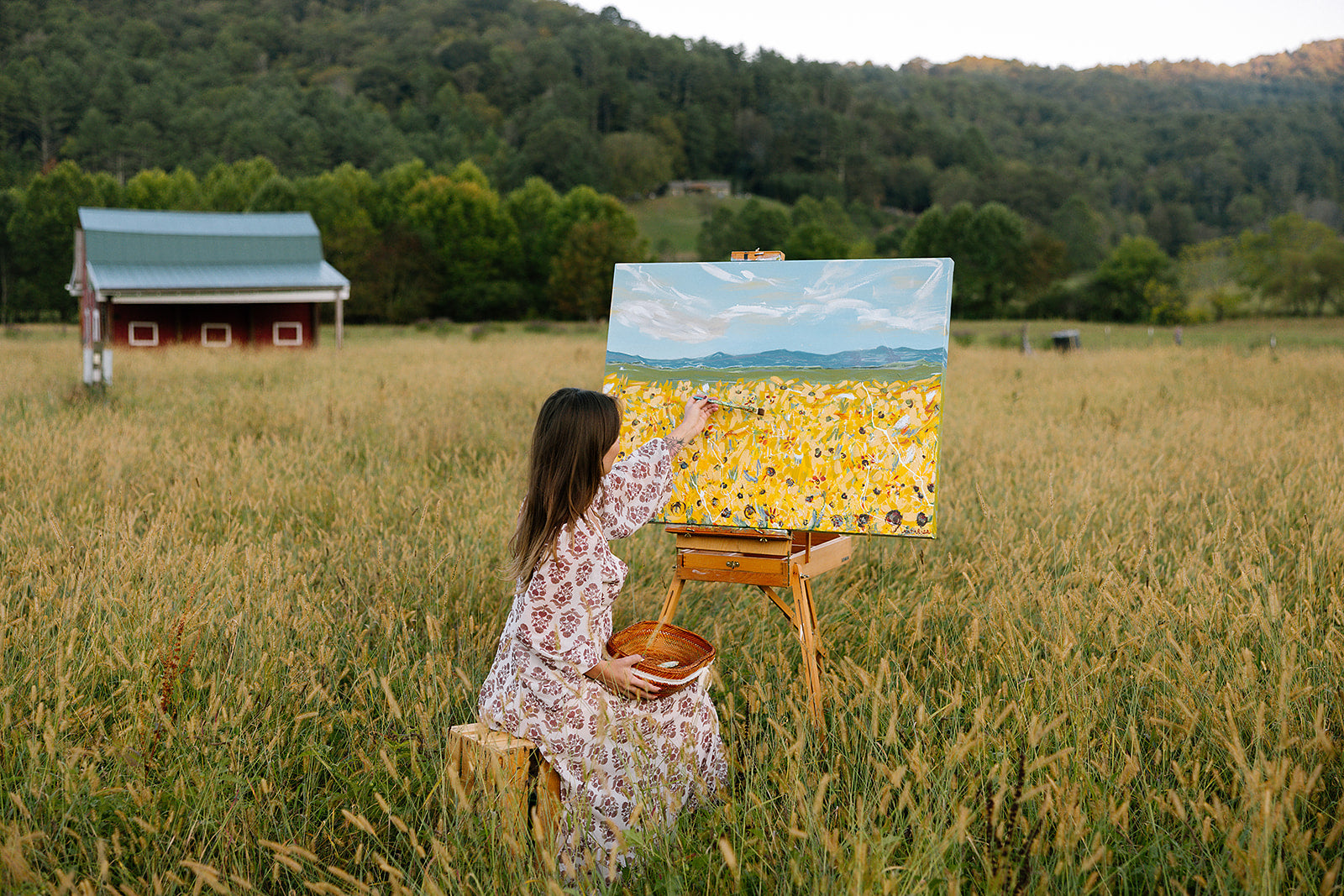 Katie is an artist based in the countryside of Western North Carolina who creates whimsical floral paintings inspired by the meadows and flora around her. Her style is inspired by a long love of colorful geometric patterns found in Moroccan tiles, mandalas, and mosaics—an inspiration that eventually led her to wrapping these patterns around the borders of her canvases in a freer, more expressive way. Her hope is to share bits of joy with hints of color in a world that can sometimes feel a little black and white.